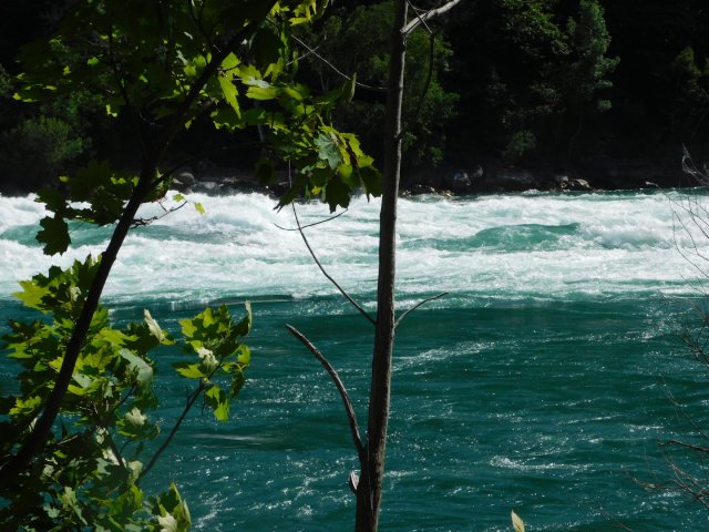 The trail running alongside this wild river is rocky and you need to watch your footing in this stretch. Memories of similar hikes in Sagres, Portugal, Camelback Mountain in Phoenix and the side trails of the Grand Canyon came back to me as I worked my way through a few particularly rocky stretches. The overhanging cliffs in the gorge felt very similar to the canyons out west, and the heat of the day reinforced that impression. The Canadian side at the river level is heavily wooded as well, and I could easily see this landscape as largely unchanged from the days before European explorers walked these paths. The only thing that betrayed the changes were crumbling concrete walls and paths from a century ago.