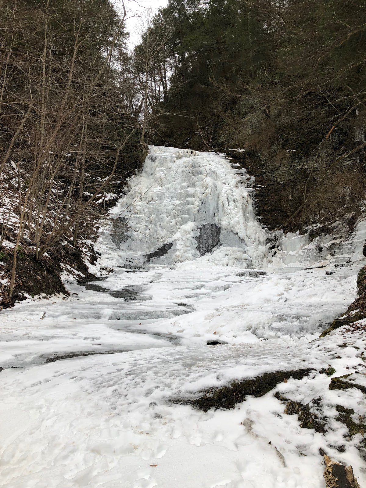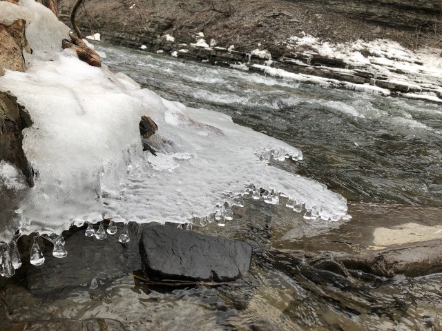 This morning I woke up and thought I’d tackle one more waterfall before I shut down this grand tour of Ithaca area waterfalls. I drove 7 minutes up the road to Lick Brook Falls at Buttermilk Falls State Park. This is a lovely and quiet spot, especially on a Sunday morning with icy, muddy trails to contend with. So on went the micro spikes over the boots. I’ve worn that combo a lot this weekend and never was it more needed than on this hike. Steep downhill stretches were a sheet of ice, all the more treacherous because if you slipped you’d likely end up in the fast moving stream.