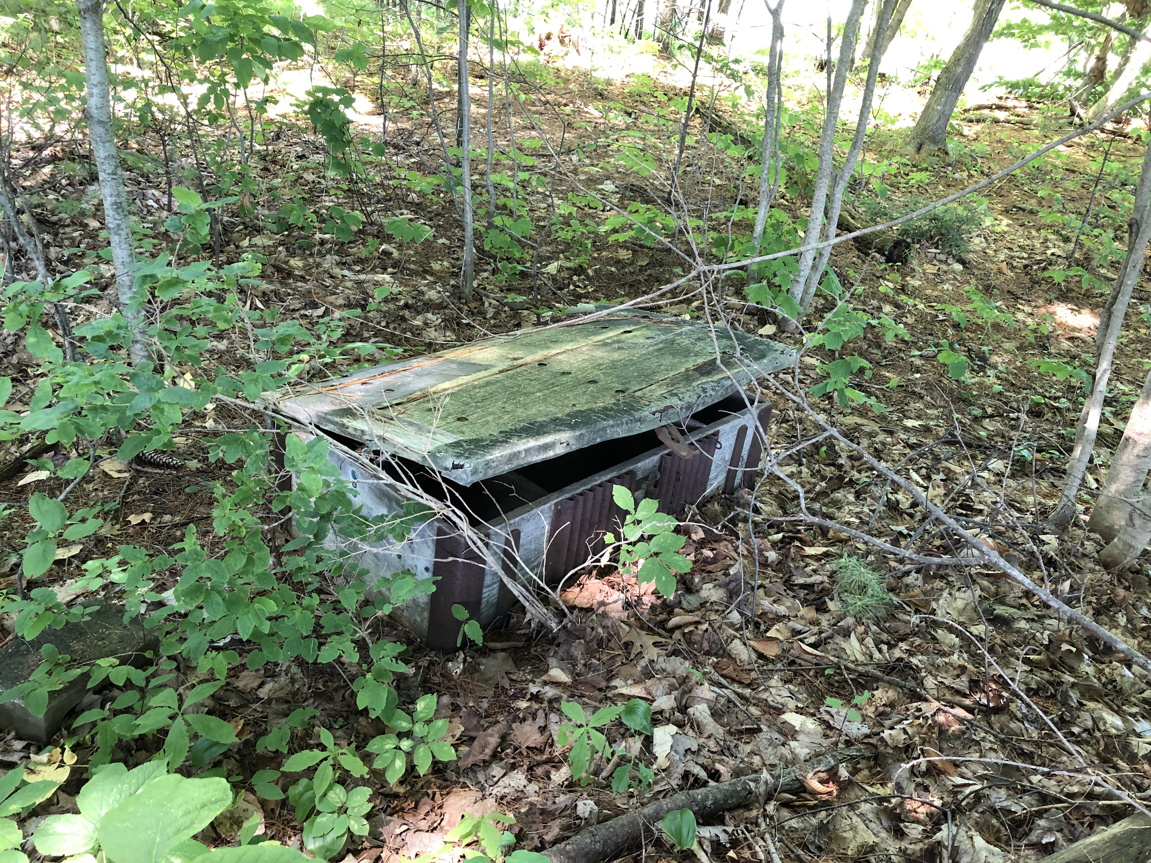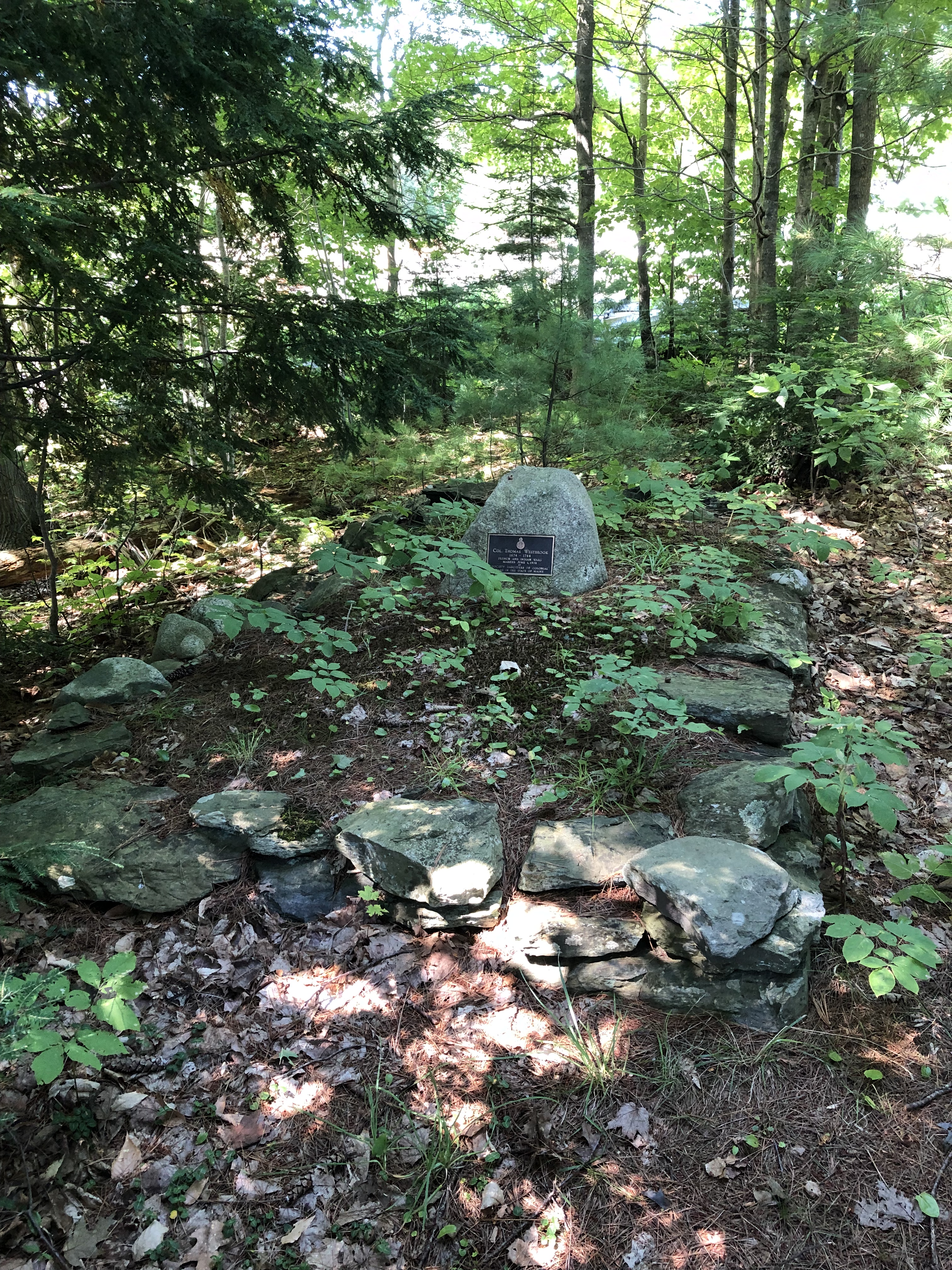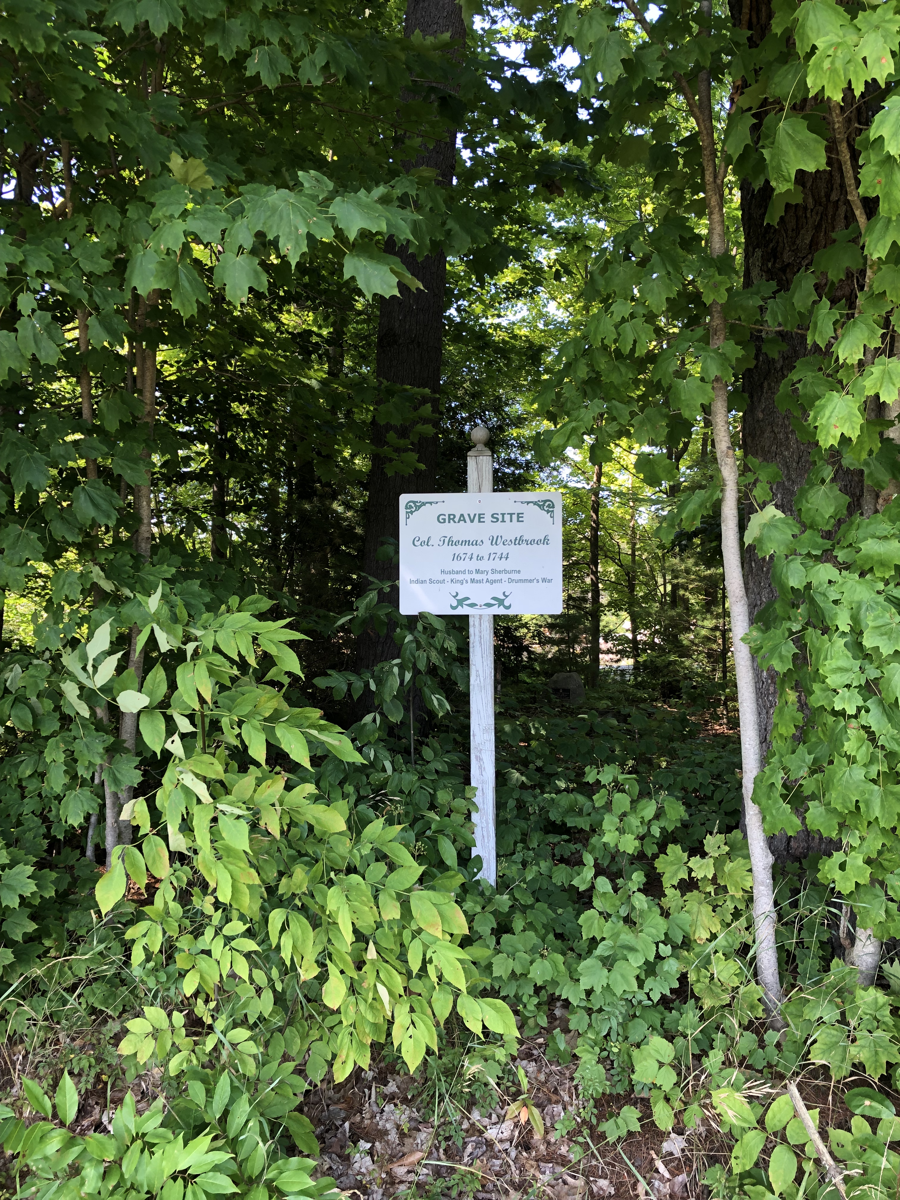 I walked the dirt and gravel road (mostly a pair of tire tracks) around the front of the lumber yard and there it was, a small white sign in front of a patch of woods marking a quiet, overgrown grave. This was the site that was revealed to the public in 1976 during the Bicentennial, making Colonel Westbrook famous throughout the area. There’s a good article that helped me greatly commemorating the 40th anniversary of that Bicentennial celebration posted in the Portland Press-Herald on August 4, 2016. Two years later it seems the Colonel has been largely forgotten again, at least judging from the overgrown condition of his gravesite. There’s a replica of Father Rale’s strong box next to the grave site, slowly returning to the earth in this shady nook.