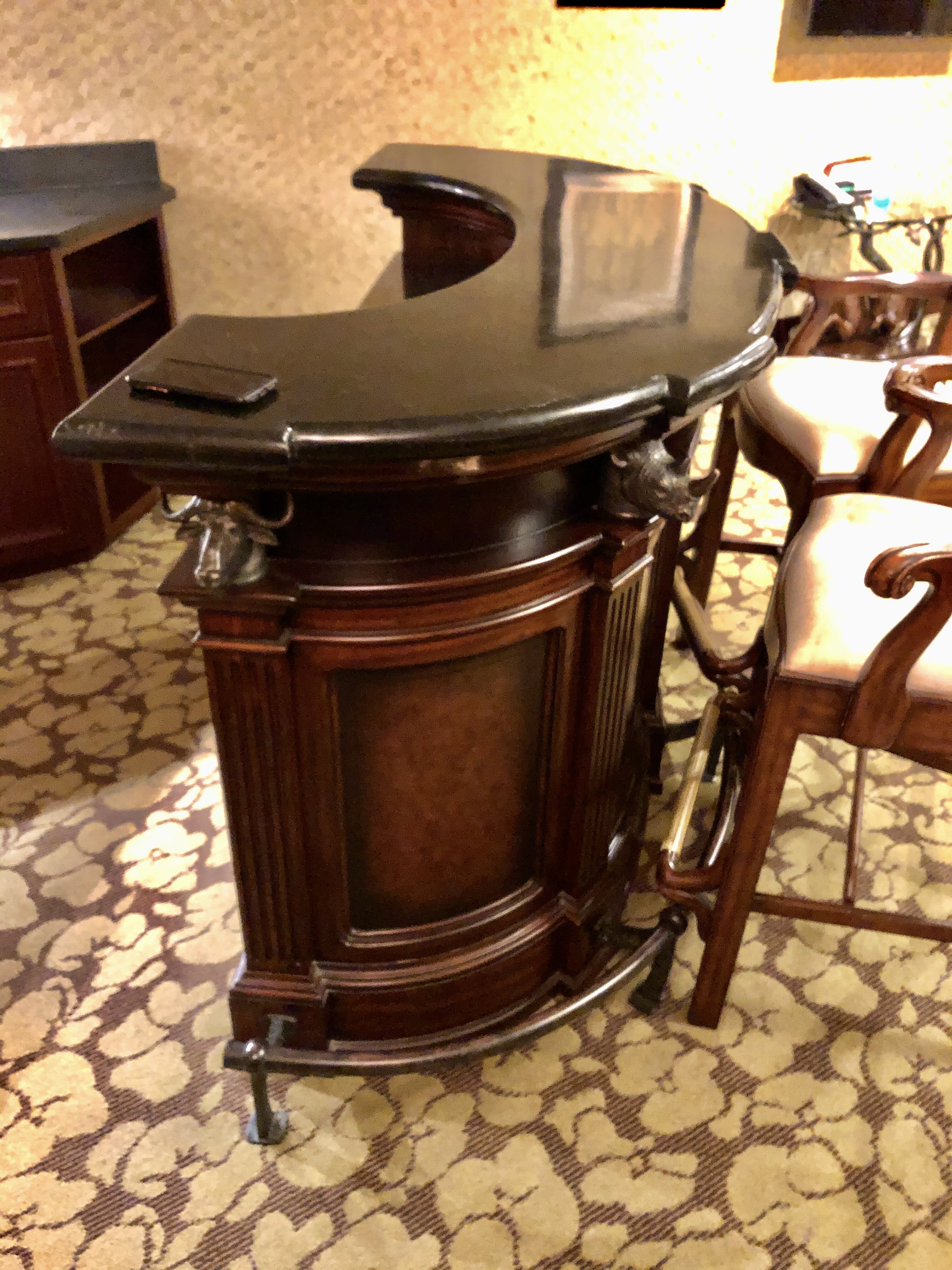 Flipping on the light, the first thing I saw was a curved bar with animal busts mounted conveniently at knee height (as I would find out later). A lion’s head sconce with flickering electric candles watched over the copper sink in the wet bar, gazelles and monkeys and wildebeests were integrated into the furniture. Bamboo and matted grass-like wallpaper completed the look. And the room went on forever (I counted 55 steps to circle the L -shaped room). A glass table with four themed chairs met me around the corner, and far down the other end was the king-sized bed with bamboo headboard. A massive walk-in closet was off to the side, with room for hundreds of outfits, and hangers for five. And capping it all off was the bathroom. This was a suite in itself, larger than many hotel rooms I’ve stayed in, with a hot tub set in the middle, a large walk-in shower to the side, toilet and avocado sink…. that’s right, an avocado sink. Surveying the entire bathroom suite were two jungle masks on either side of the sink that kept staring at me and a large hippo bench that looked like it would roll over and have me rub its belly. Wow, where do you begin?