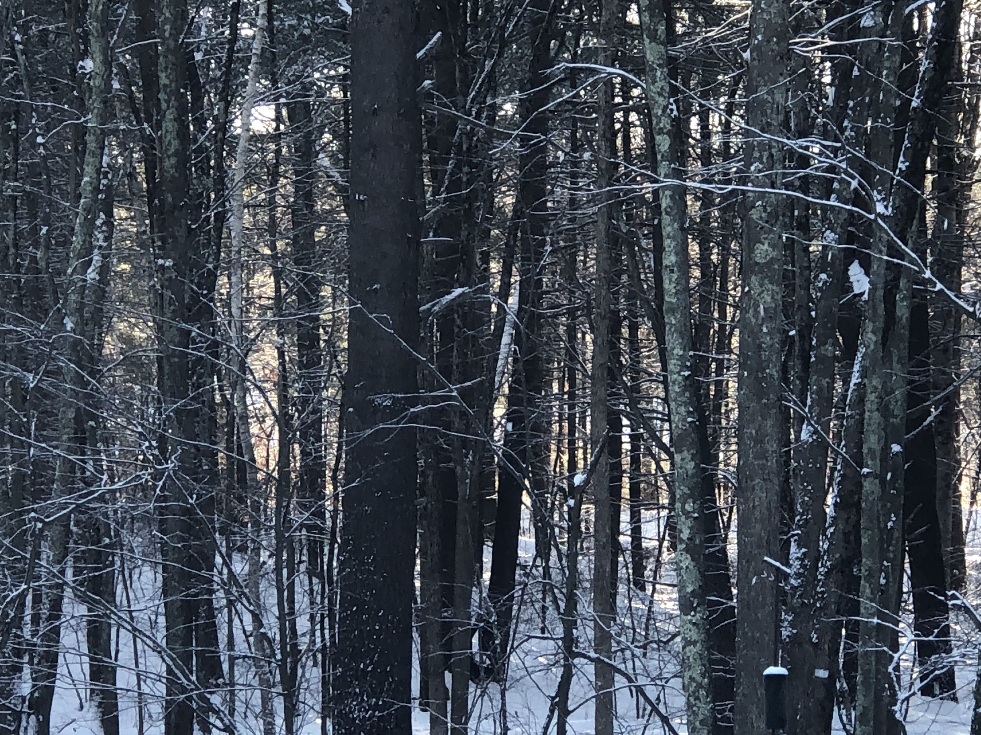 Still, there’s nothing like fresh snow on a sunny morning, and I can finally pause long enough to appreciate it. It’s a stark background that pushes things that normally recede into the background forward. Hillsides of gray and black tree trunks rolled in waves alongside me for much of the week. Back home with the sun unmasked for the first time in a week, I watch the dance of illumination and shadow as sunbeams find their way through the woods with no leaves to block them as they explore. Puffs of snow drift of branches, stirred by the wind, mixing with rays of light and remind me the woods are never still, even after snowfall. Looking deeper into the woods squirrels scurry about, puffy gray tails bouncing all the while, in search of food hidden under the snow. Birds zip to the feeder and back to cover, always watchful for hawks and neighborhood cats. I wonder at the performance as my indoor cat snacks me with her tail, yearning to be free of the glass keeping her from the hunt.