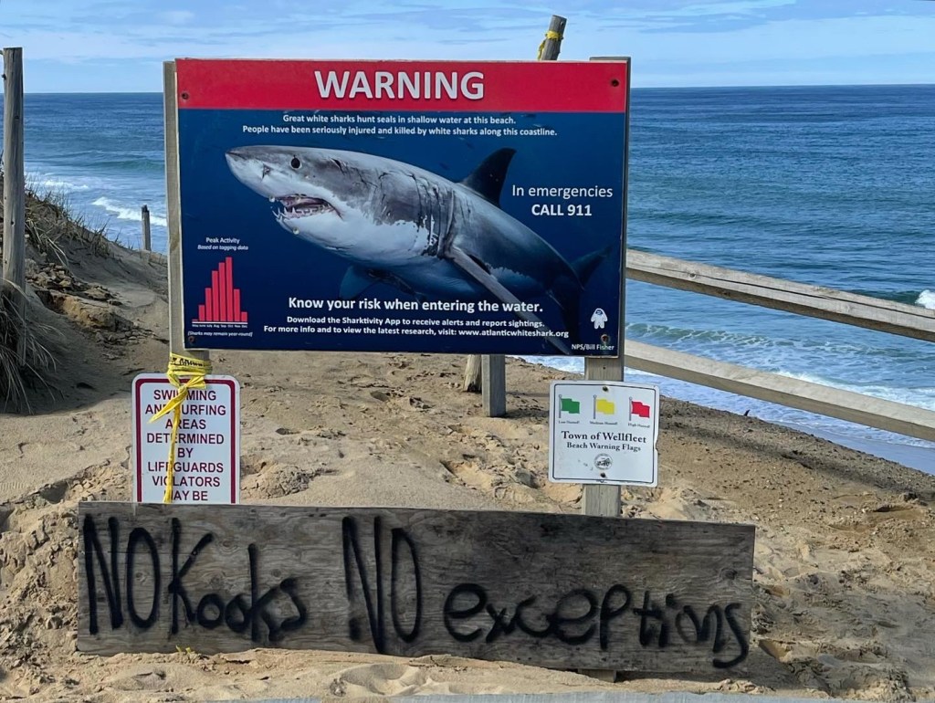 Between the massive dunes and the crashing Atlantic Ocean in Wellfleet is a strip of sandy beach bearing the brunt of the relentless assault from wind and sea. The surf in warmer months is a feeding ground for Great White Sharks, who have modified their hunting style to chase grey seals right into the churning shallows that swimming humans like to frolic in during the warmer months. Great Whites don’t hunt humans, but sometimes they mistake humans for seals.