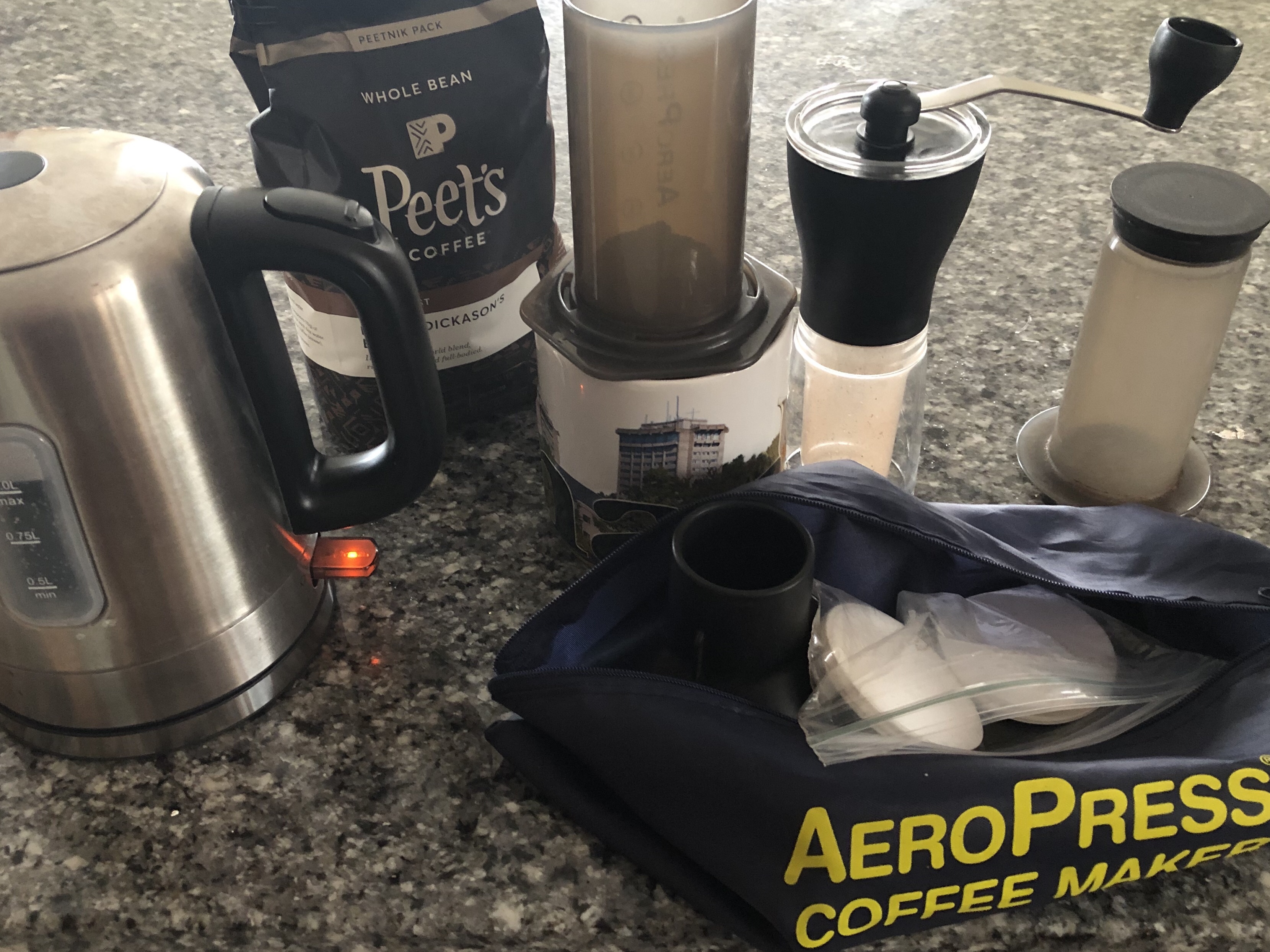 This week I’ve had the opportunity to assess four distinct coffee blends with my trusty AeroPress coffee maker. Two Peet’s (Berkeley, CA) Major Dickinson blends, one pre-ground and one whole bean. A Stumptown (Portland, OR) Hair Bender pre-ground blend and finally, a Blue Harbor (Hampton, NH) Sumatra whole bean blend. This gave me a unique testing lab to compare the differences, with the AeroPress and the water consistent for each cup.