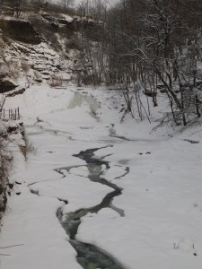 Today I found myself hunkered down in a hotel in Ithaca, NY. For a snow town they do a lousy job plowing this city during a storm. Ithaca is known for its hard winters, its hills, and its gorges. And of course the gorges are where you’ll find the waterfalls. Like this one, Cascadilla Falls, from the creek that bears the same name.