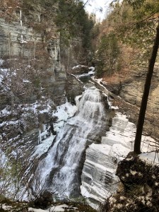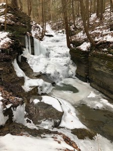This morning I woke up and thought I’d tackle one more waterfall before I shut down this grand tour of Ithaca area waterfalls. I drove 7 minutes up the road to Lick Brook Falls at Buttermilk Falls State Park. This is a lovely and quiet spot, especially on a Sunday morning with icy, muddy trails to contend with. So on went the micro spikes over the boots. I’ve worn that combo a lot this weekend and never was it more needed than on this hike. Steep downhill stretches were a sheet of ice, all the more treacherous because if you slipped you’d likely end up in the fast moving stream.
