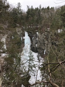 I started with Taughanock Falls. This was the furthest away but one I really wanted to hike to. I drove out to Ulysses and changed into my winter boots for the hike. I’d contemplated this hike before I drove out here so I also put on micro spikes, as I expected the conditions to be icy. My expectations were met. The path to the falls was about a mile long with a mix of ice, snow and mud. I passed 50 or 60 people on this walk and I was the only one wearing micro spikes. A few people pointed to them and said they wished they’d thought to bring them too. Taughanock Falls on a mild February day were spectacular.