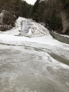Finally, I drove out to the Robert H. Treman State Park to see Lucifer Falls. Waze sent me past the state park parking lot to the service road on the other side of the Enfield Creek. This ended up working out really well as there was a nice path down to the creek on that side. This was another hike where micro spikes were invaluable. I’m not sure I would have chanced the hike without them. This hike reminded me of New Hampshire. There were hemlock trees shading the path, and with the icy conditions I was one of the only people out on the trail.