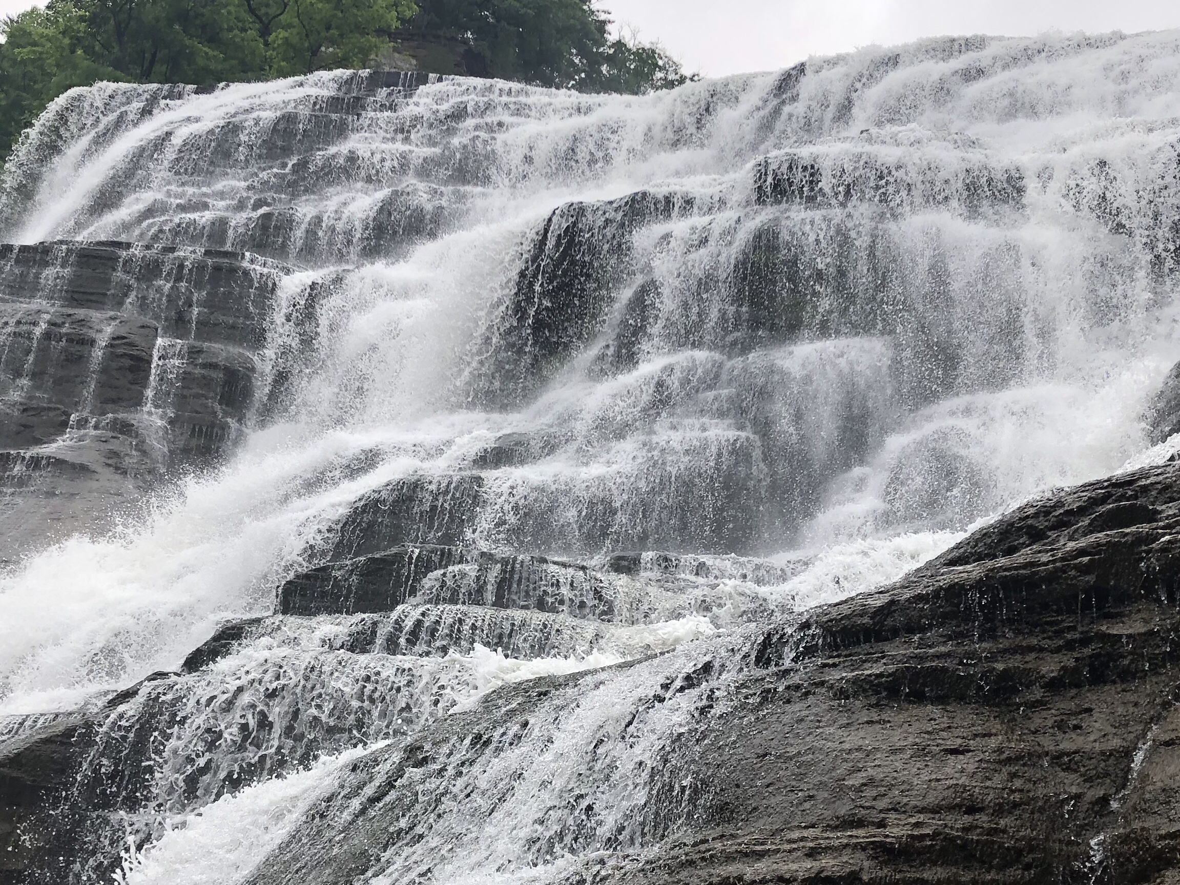 Bridal Veil Falls was more obvious, with a parking lot and good signage. There’s a boardwalk that helps you navigate the walk down to the falls easily. This makes this site good for all ages. With the stairs it would be challenging for wheelchairs to get all the way to the falls using this path, but there seemed to be an alternative on the other side of the river that might have worked. Bridal Veil Falls was roaring from all the rain, and reminded me of similar falls I’ve visited in Ithaca, New York.
