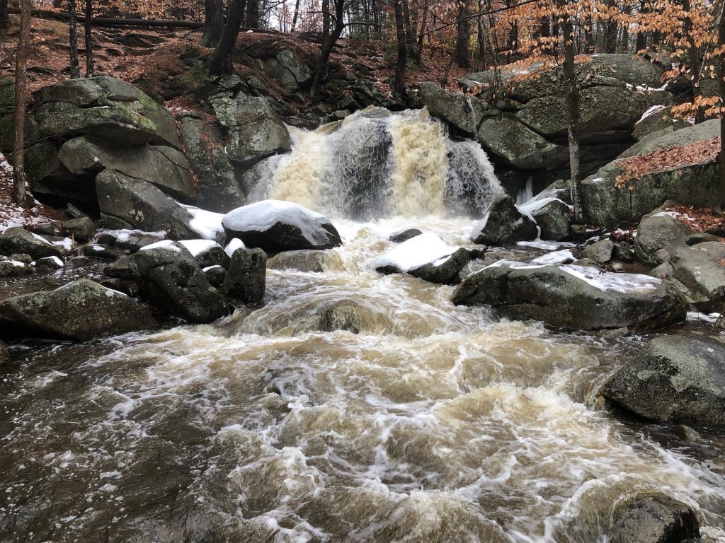 The day started with heavy, gusty rain. The kind of rain that would be a nor’easter had it been snow. The kind of rain that makes you glad you’re indoors looking out a window at it. And paradoxically, the kind of rain I wanted to be outside fully alive in. There’s an edge to any storm, and this one was abating just enough to prompt me to pursue a micro adventure or two. I packed up my rain gear and a water bottle and headed out to visit waterfalls.