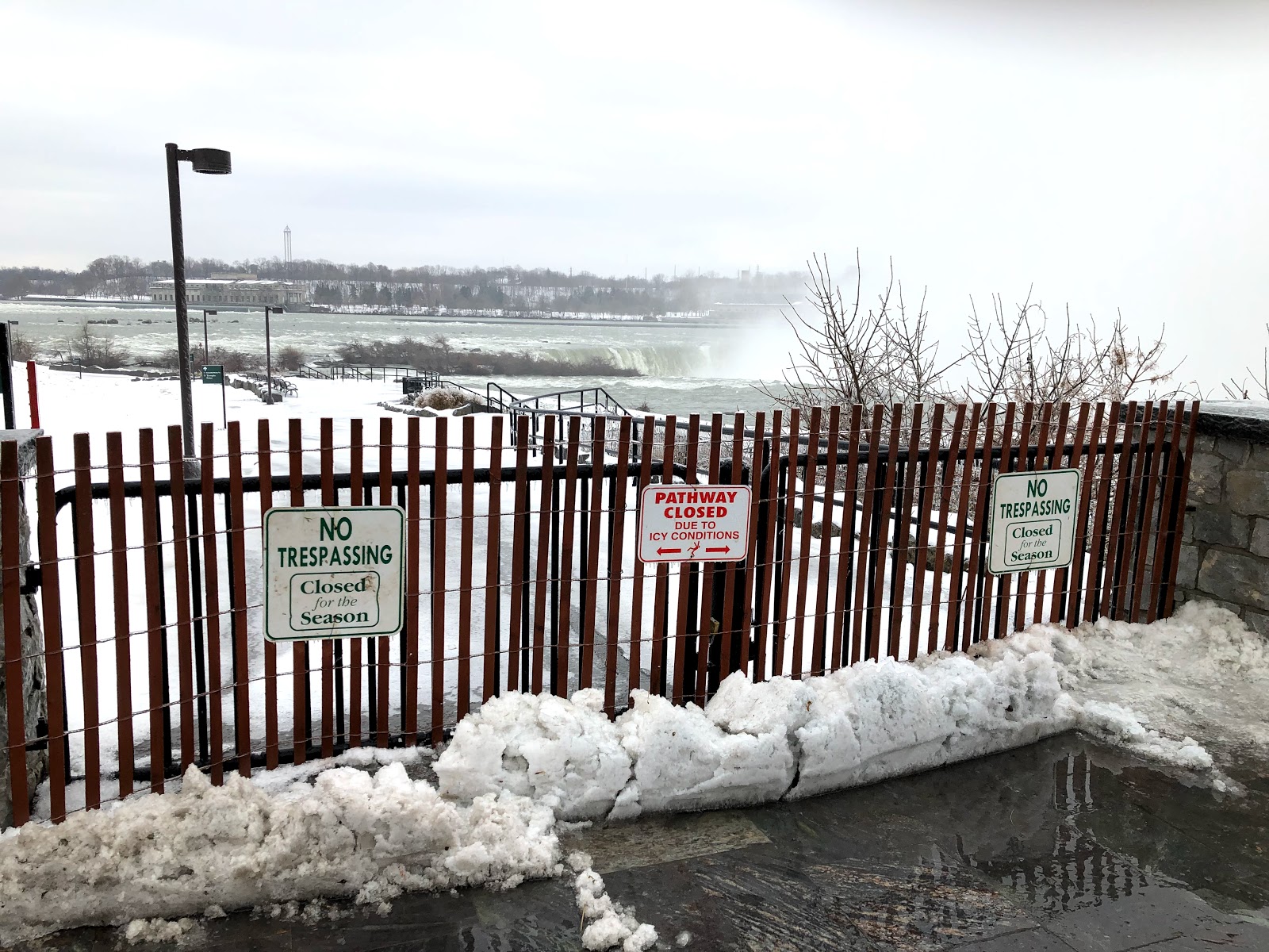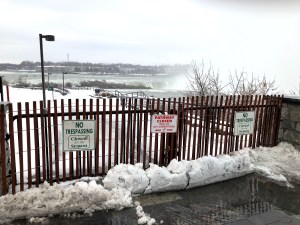 In the back of my mind from the moment I thought up this idea the night before, across the frozen tundra and the treacherous white water of the American Rapids, and then shuffling along the icy walkways where the mist from the falls froze on the paved paths, that there’s no way that the park service would have Terrapin Point open. It would be way too dangerous having tourists on a sheet of ice inches away from the falls. People die in summertime when they lean over too far to take a picture. In winter? Forget it. Self-selection is a great theory but who’s going to clean up the mess? No chance at all it’s going to be open. And sure enough…