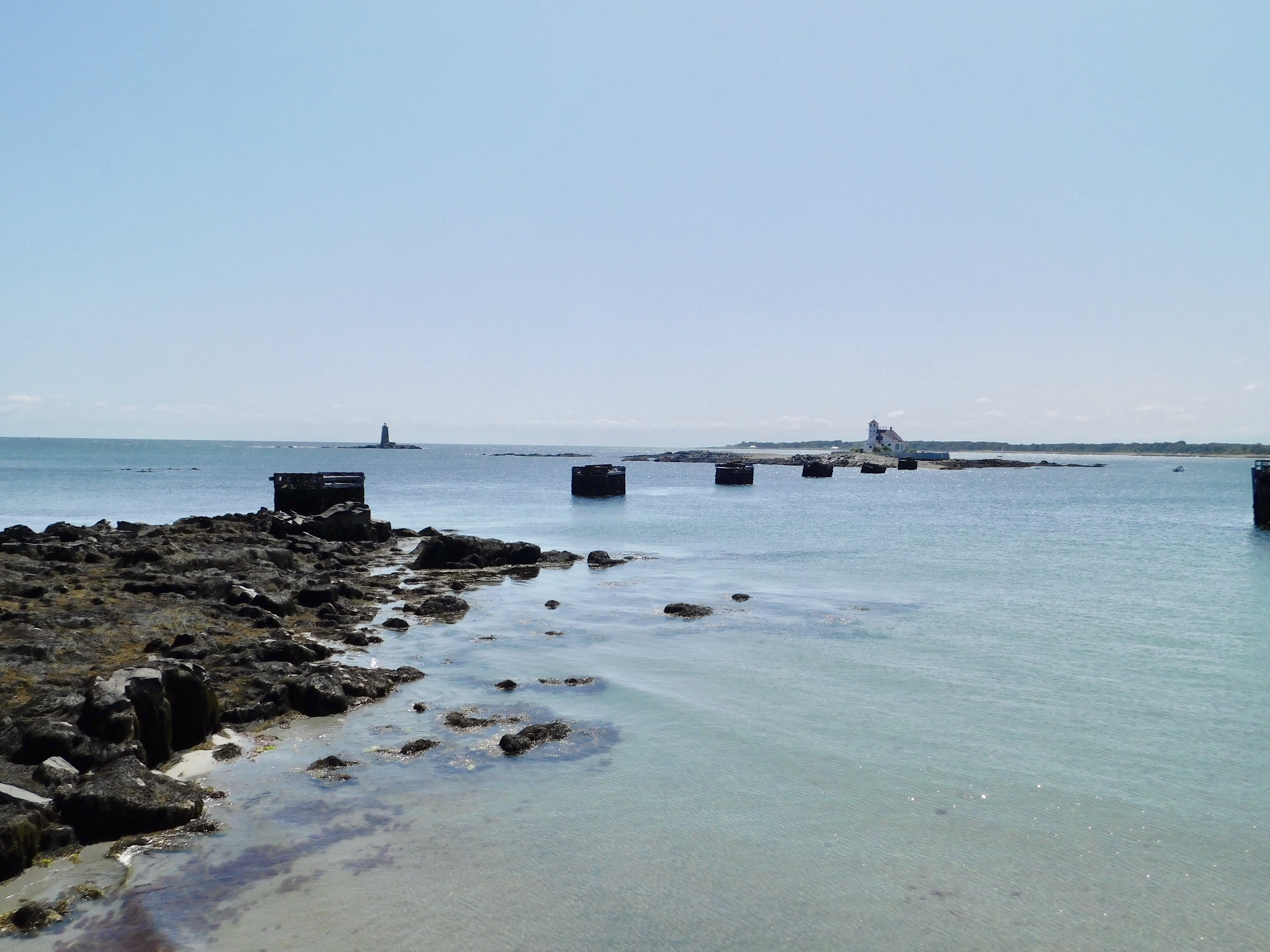 Fort Foster today offers glimpses of that past.  You can still climb up into the concrete bunker and see the bolts that once secured the disappearing artillery.  But the real reason to visit Fort Foster is to walk on the unique beaches at the Mouth of the Piscataqua River, walk out on the pier to get a closer look at Wood Island with it’s lifesaving station, and Whaleback Light.  There’s been a lighthouse on this spot since 1820, and the one you see now was built in 1872.  The lighthouse keepers surely had a lonely job on that pile of rocks.